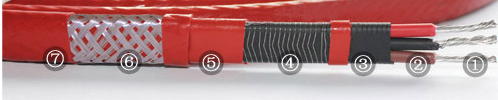 ① 鍍錫圓銅線; ② 芯線絕緣層; ③ 內(nèi)護(hù)套絕緣層; ④ 發(fā)熱絲; ⑤ 外護(hù)套; ⑥ 金屬編織層; ⑦ 加強(qiáng)護(hù)套