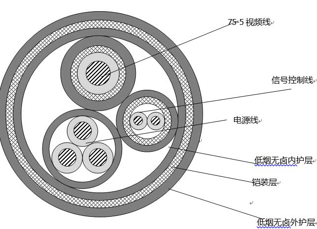船用組合電纜(3+2+1)用途:用于大型船舶及海上石油平臺的視頻監(jiān)控系統(tǒng),作為綜合布線。
